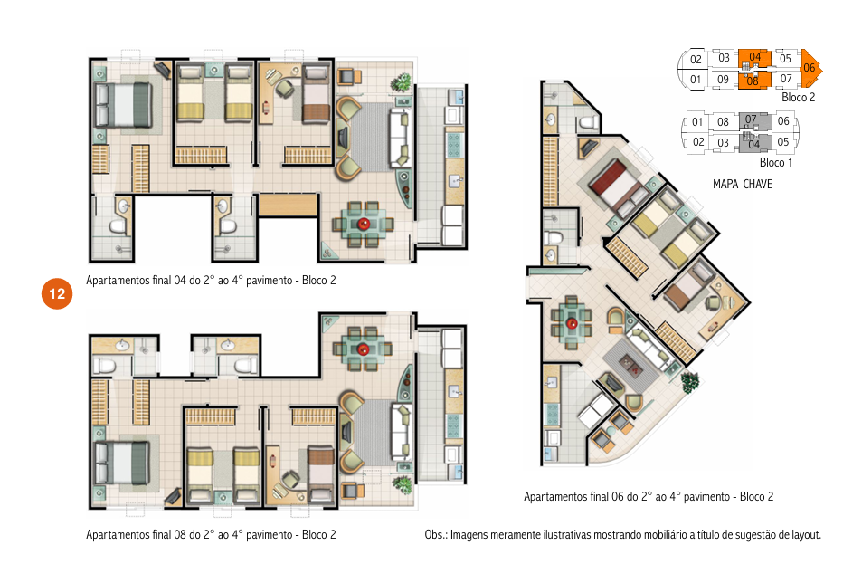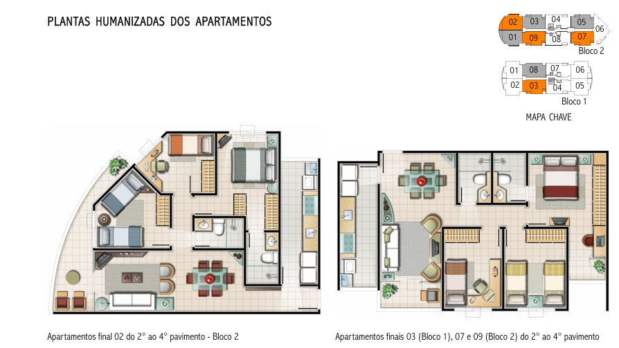 - 8 unidades por pavimento no bloco 1 e 9 unidades por pavimento no bloco 2 (o primeiro pavimento tem 8 unidades).