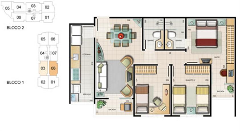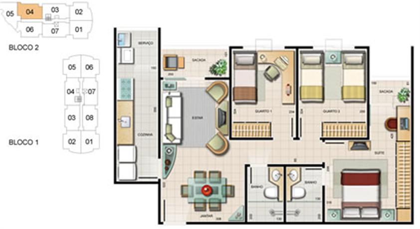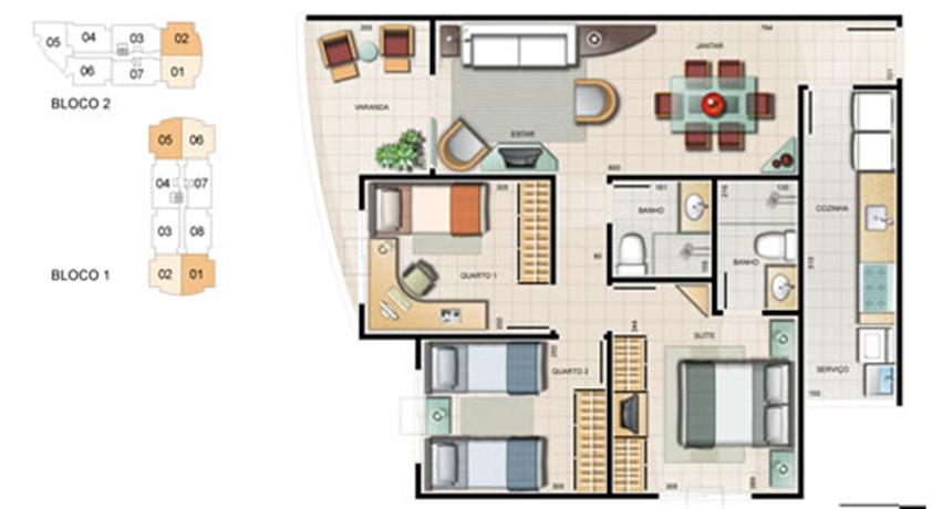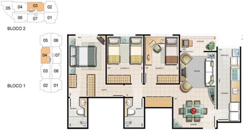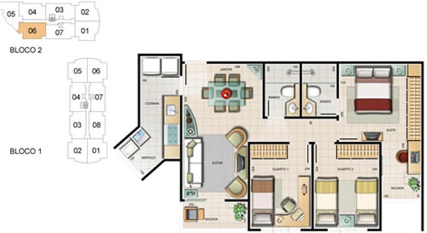 - 8 apartamentos por andar no bloco 1 e 7 apartamentos por andar no bloco 2;