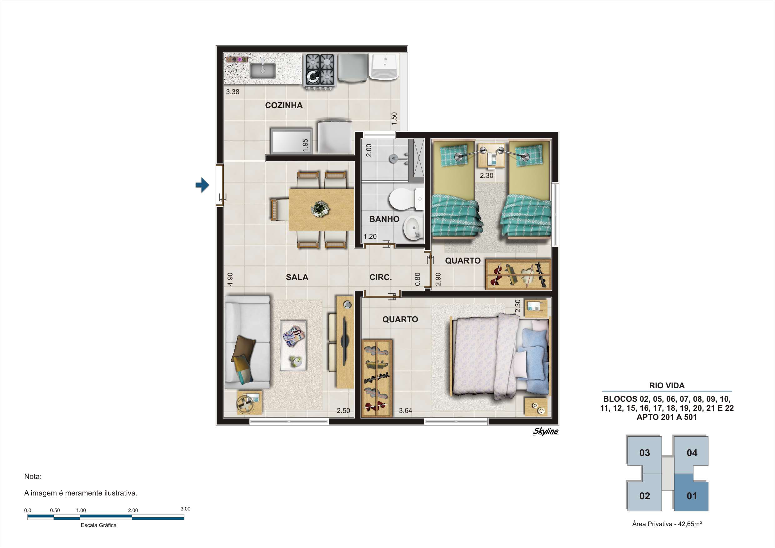 - Apartamentos de 42,8 m2 com 2 quartos.