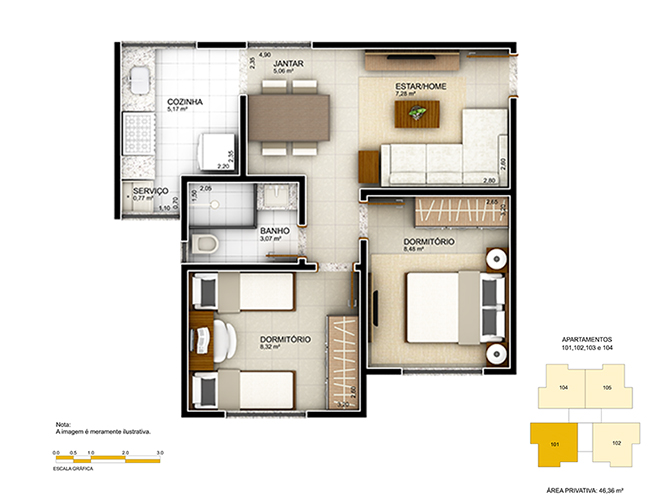 - Apartamentos com metragem de 45,89 m² à 46,01 m².
